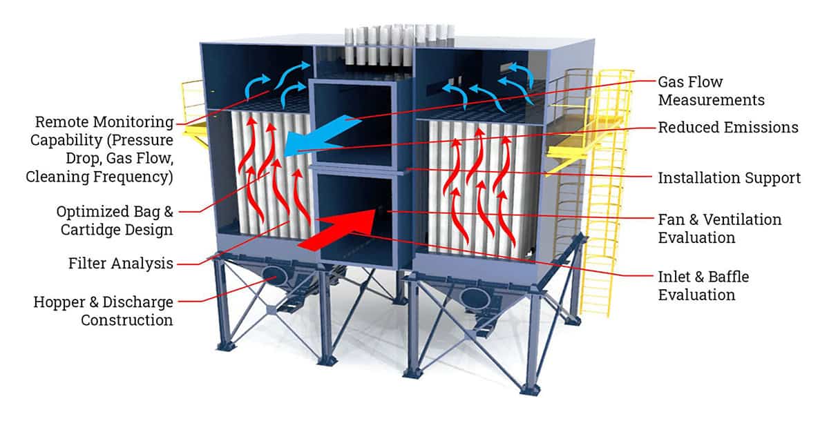 A baghouse dust-collection structure or device uses tubes, envelopes, or cartridges to gather dirt, particulate matter, and dust from the off-gases stream of a manufacturing or processing plant. Particulates separation from the air steam is carried out by separation media or bags. As filtration proceeds, the filtrate is accumulated on the filter cloth, forming a layer of increasing thickness, called dust cake. The development of the dust cake worsens the filtration conditions over time until it becomes so thick and large that it obstructs airflow and requires cleaning the bag filters. Most common cleaning techniques are the application of reverse air flow, bag shaking, and the application of pulse jet.
